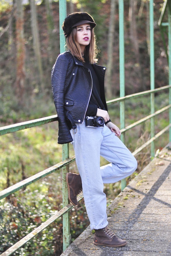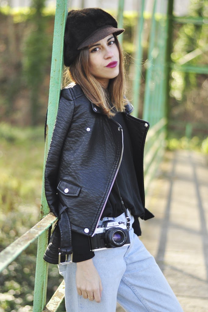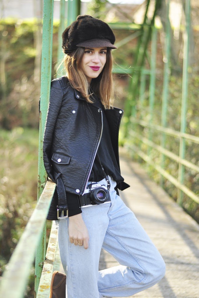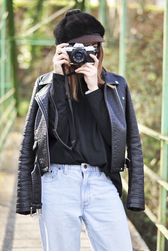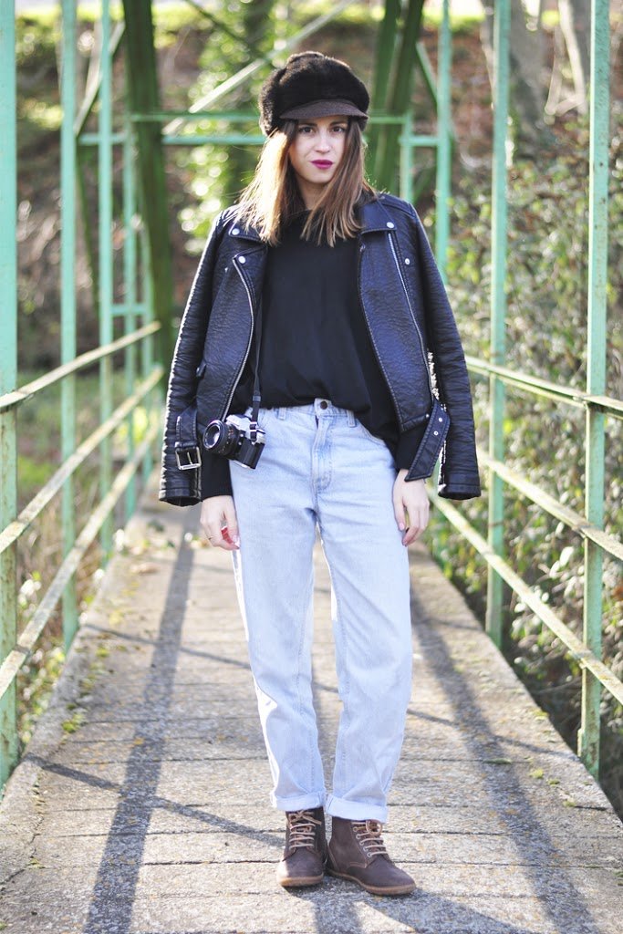 Este look con el negro, el perfecto y el levi’s tiene como base el mismo que he puesto justo hoy yo, pero no tienen nada que ver así que me parece perfecto y el toque que le da la gorra me encanta.