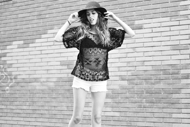Que mona que es la camiseta!! te ha quedado un look genial, si tal vez yo no me atrevo con el sombrero e incluso con el crochet sin nada debajo pero a ti te queda genial guapa!!
