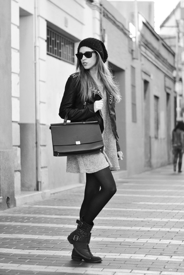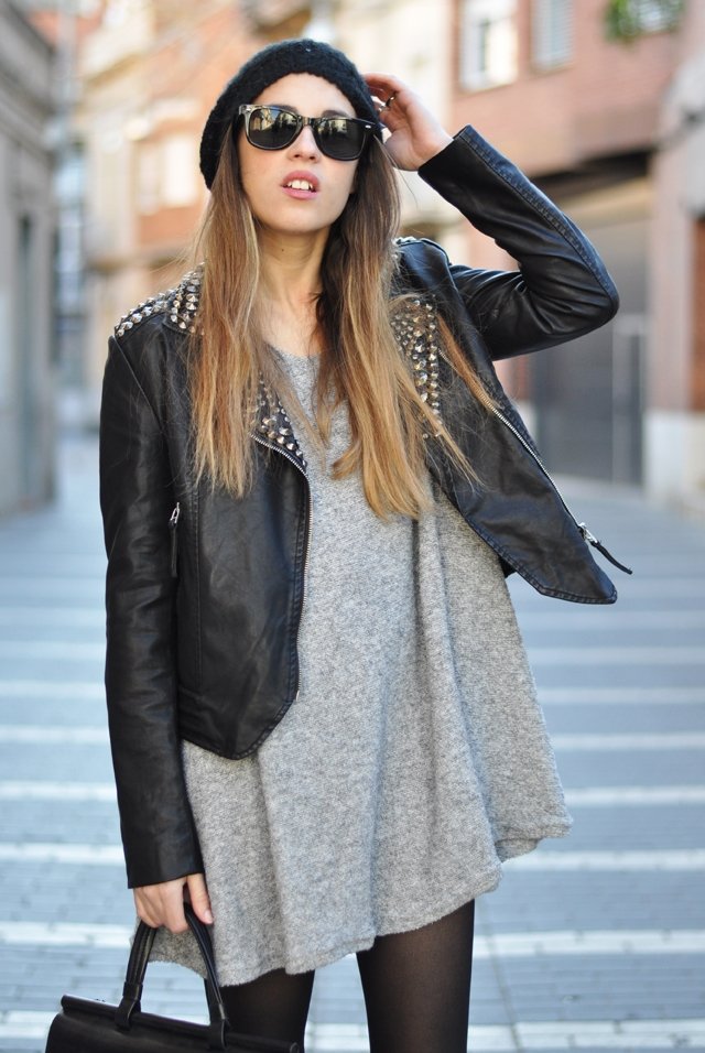 estás guapísima! me encanta el vestido gris tan sencillo combinado con la chupa y las botas con el detalle de las tachuelas! ^^ una muy buena elección. Un besote <3