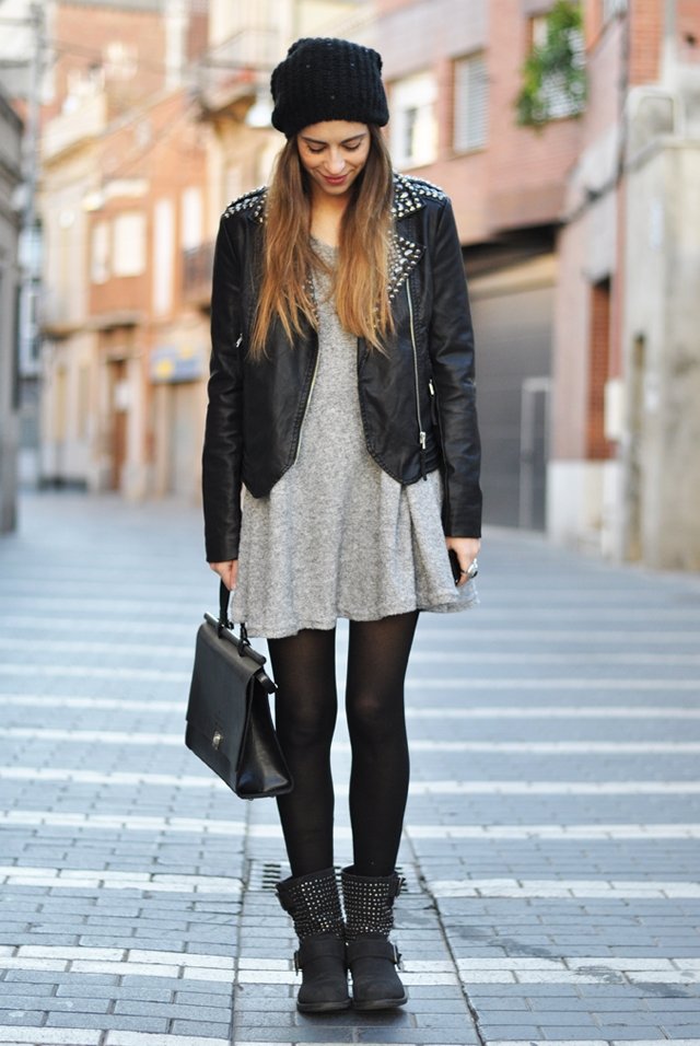 esque ese vestido gris con una chupa d cuero es una gran eleccion. y ademas me encanta el detalle lo bien que combinan las botas y la chupa.