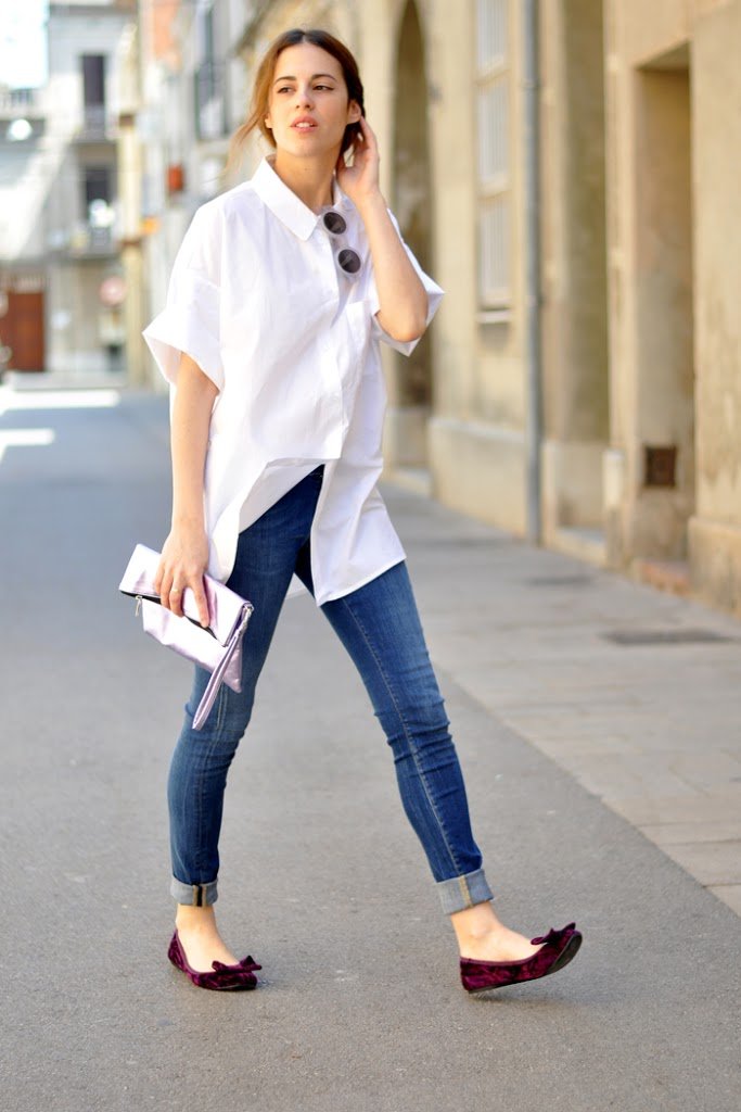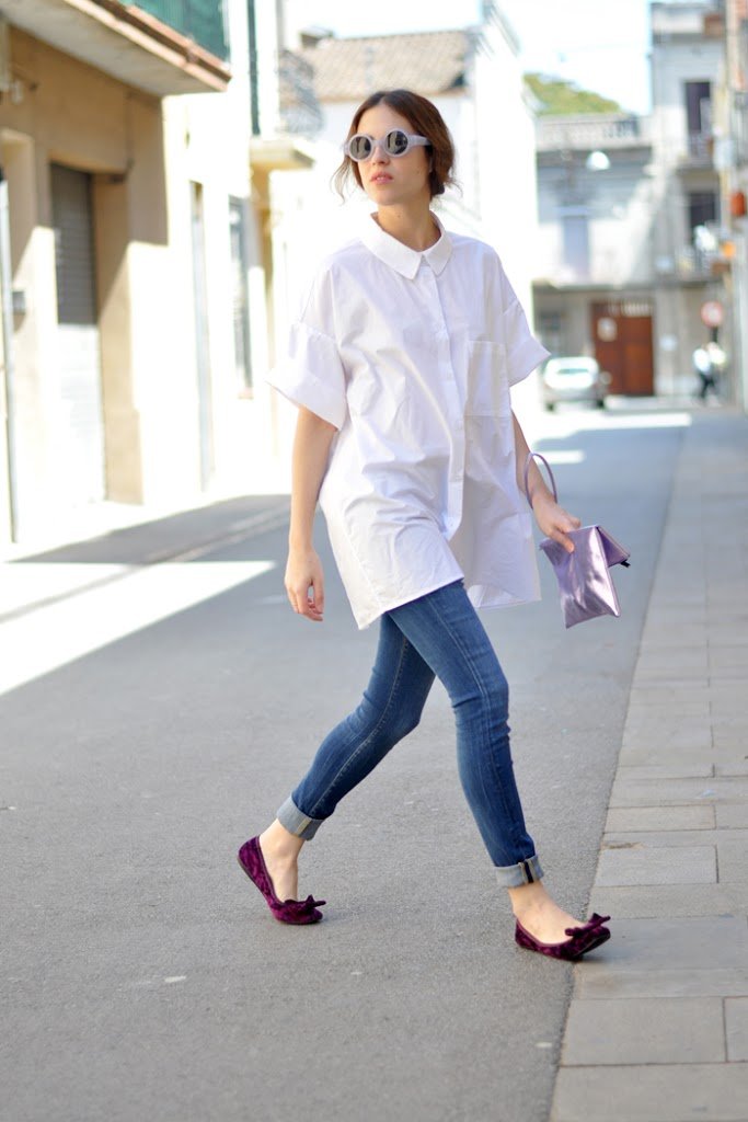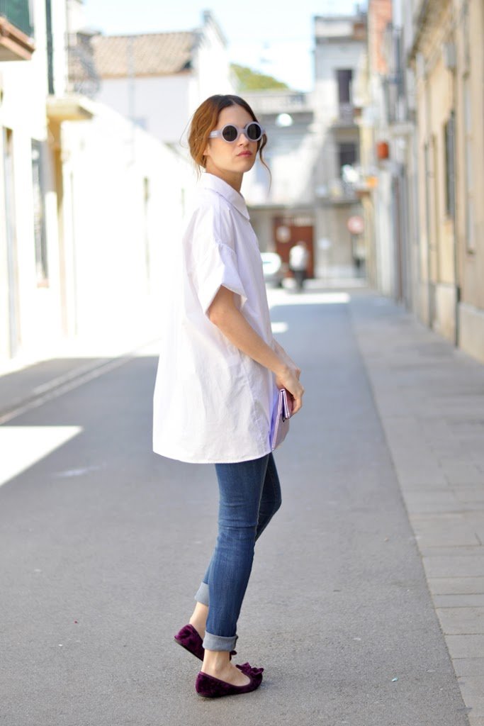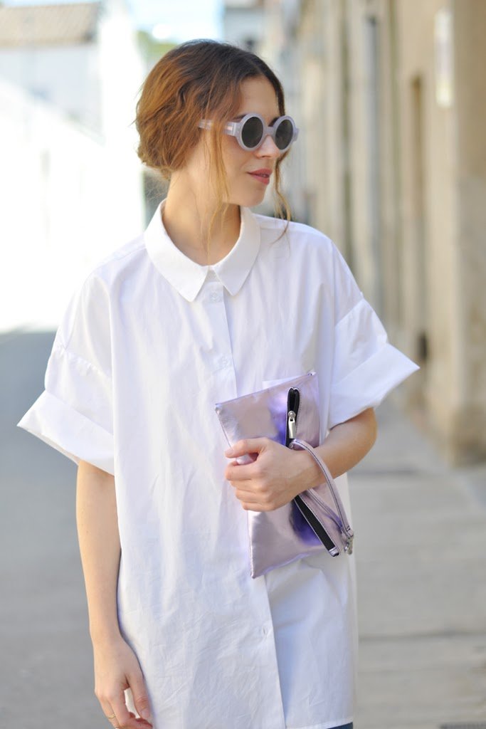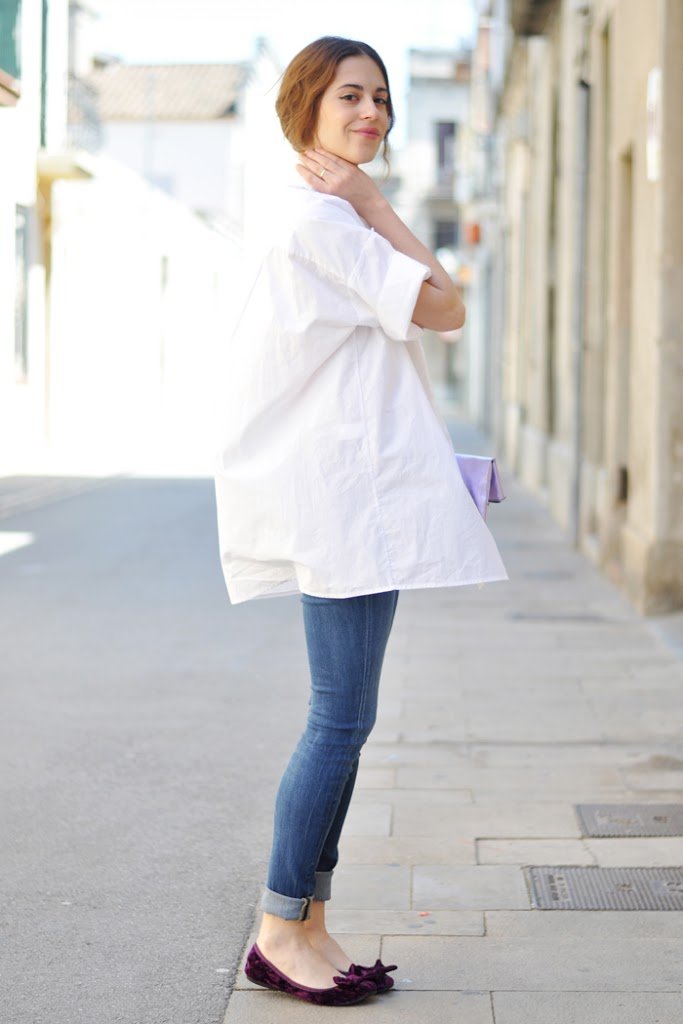 Estaba deseando ver algunos grados más para estrenar mi enorme camisa de Purificación Garcia. Unos jeans básicos y todos los complementos en color violeta. Un recogido bajo y… ¡Lista!