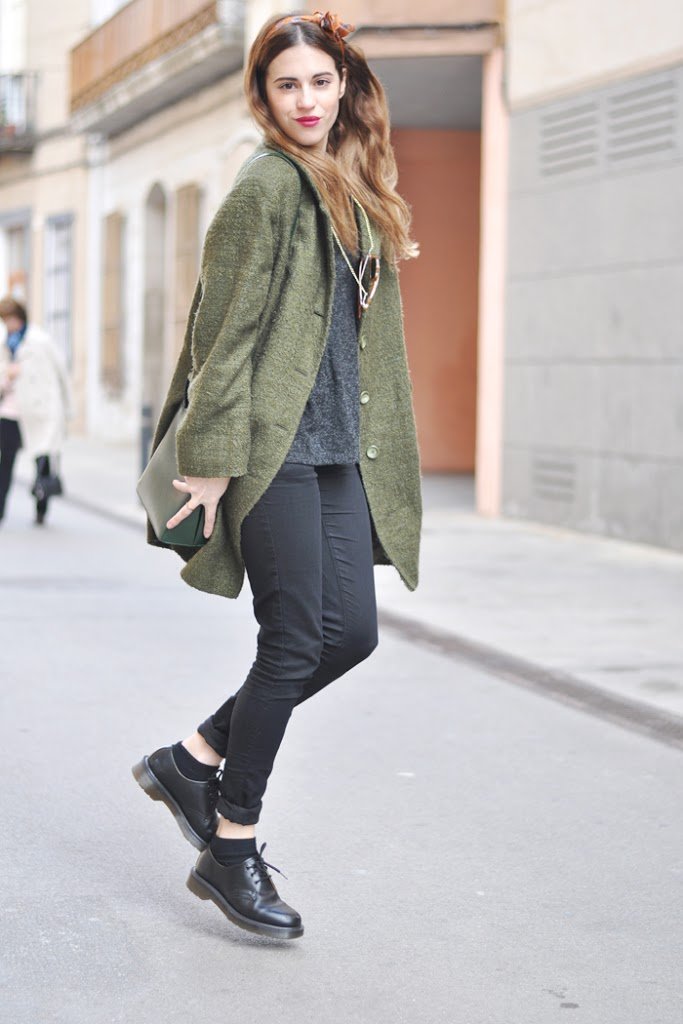 With this look I went with the family to the cinema. A great plan together. For this Saturday afternoon I chose a look very comfortable. Black jeans, basic sweater, my shoes (Martens) and a bit of «color», a green vintage military jacket and a scarf (tie man) in the hair and lips very marked. Hope you like it, thank you very much for all the previous comments.