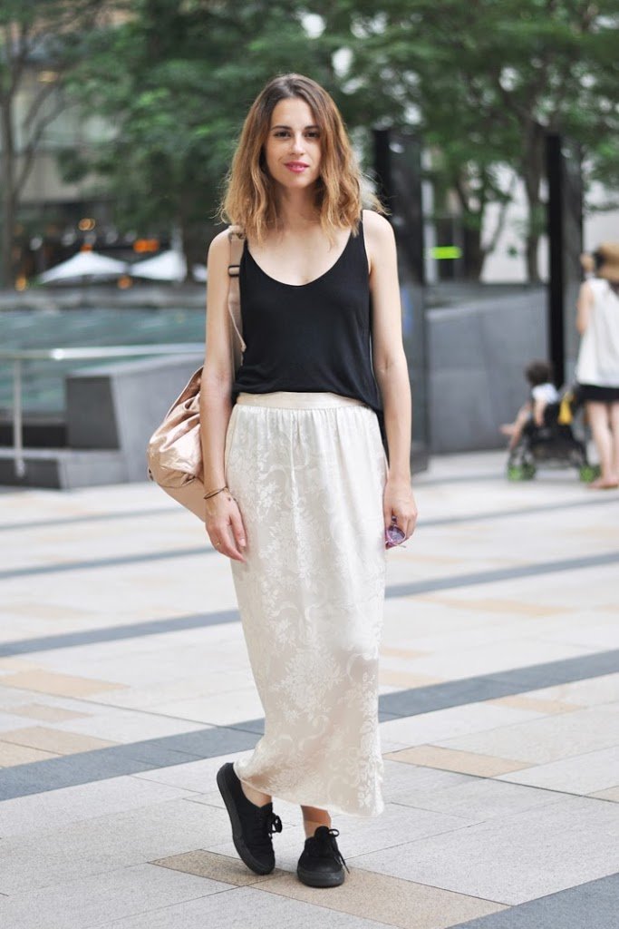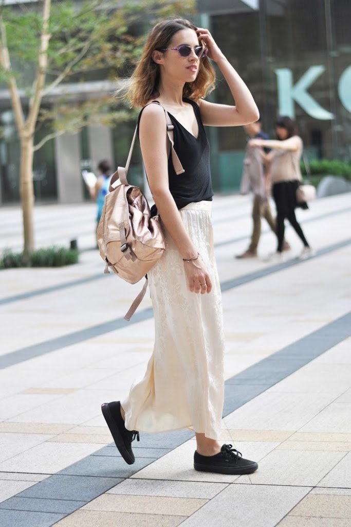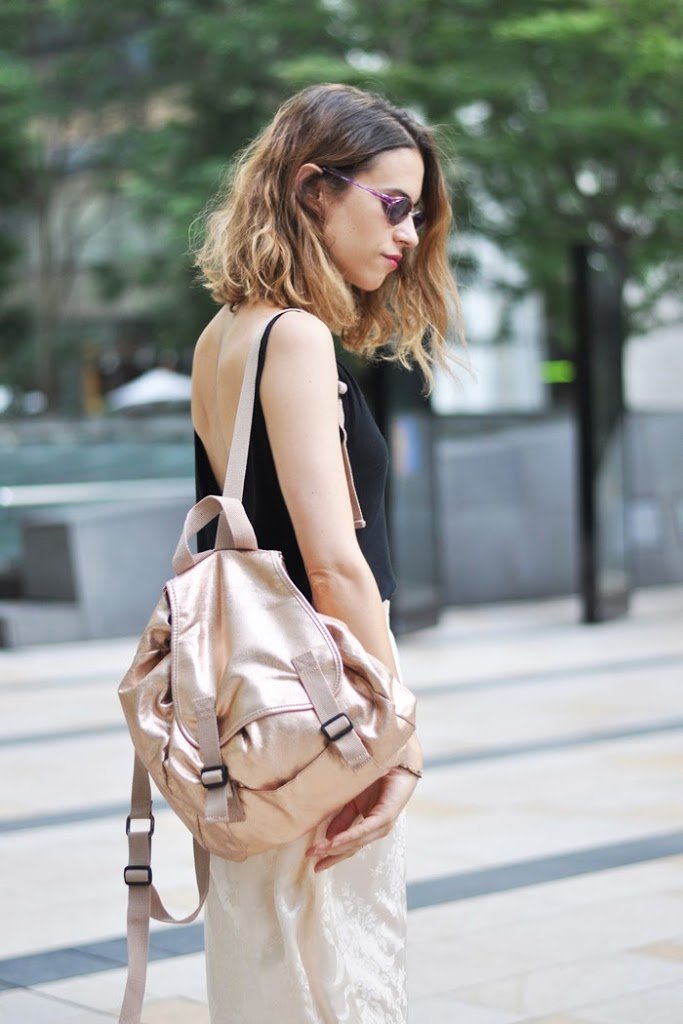 ¿Mi look para ese día? una fina camiseta de algodón, unas zapatillas bien cómodas, una falda larga de raso con un estampado algo oriental que compré en Ebay y mi mochila metalizada de Sfera de hace dos temporadas.