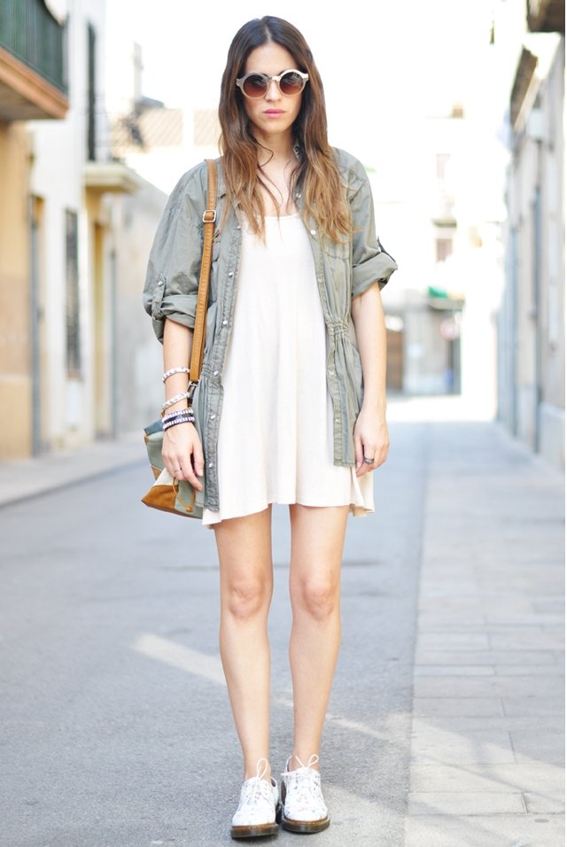 Me gusta el toque de la camisa caqui encima del vestido, como tu has dicho muy apropiada y necesaria para los momentos ‘aire acondicionado’!