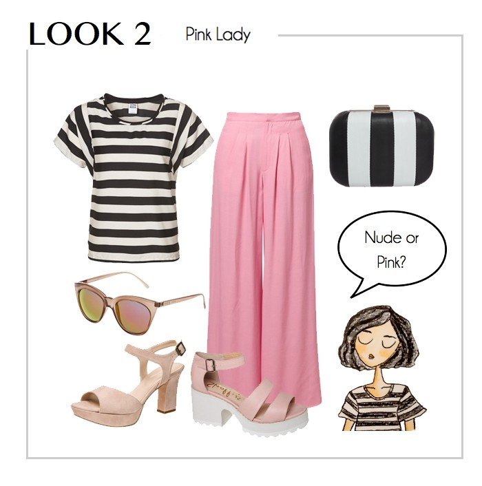El siguiente look muy años 70′ con esa gran tendencia para esta primavera, las rayas b/n. Me ha encantado esta combinación con unos amplios pantalones en color rosa. El calzado lo elegís vosotras. ¿Con cuál os quedáis? Nude o Rosas