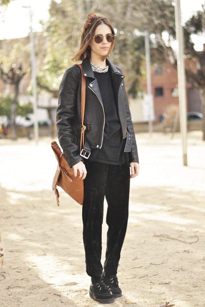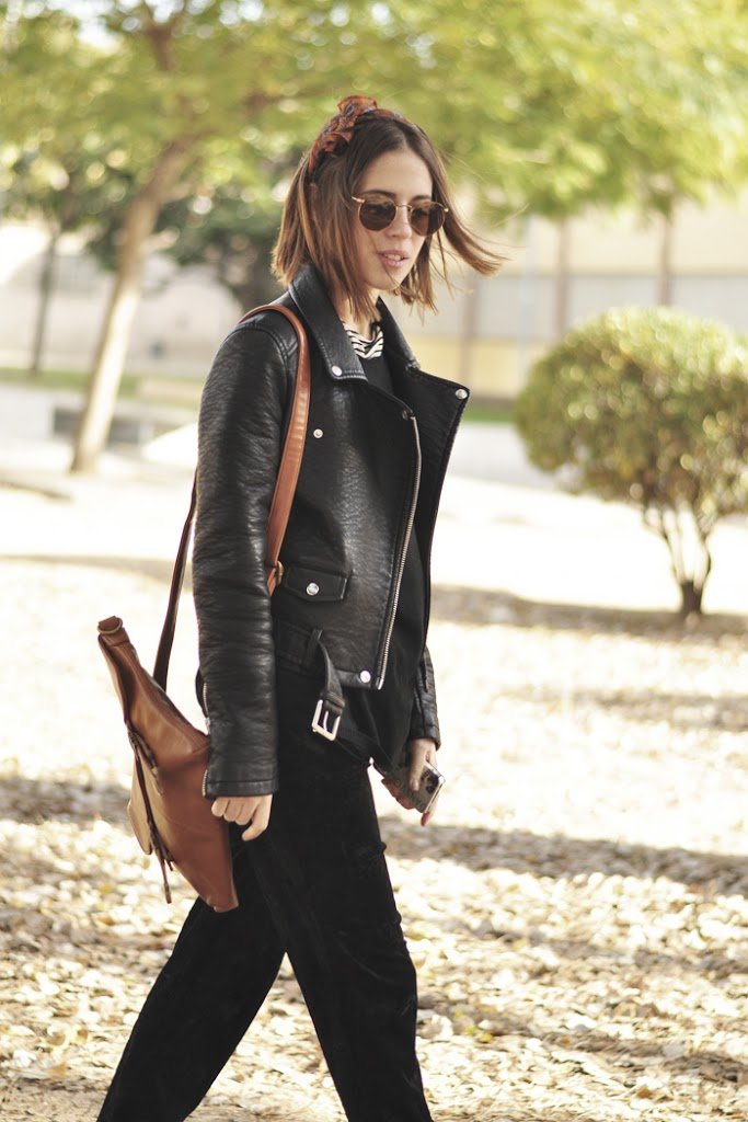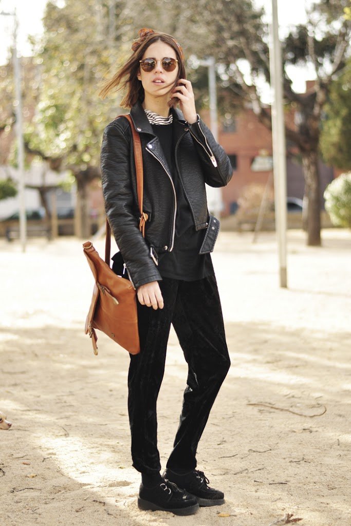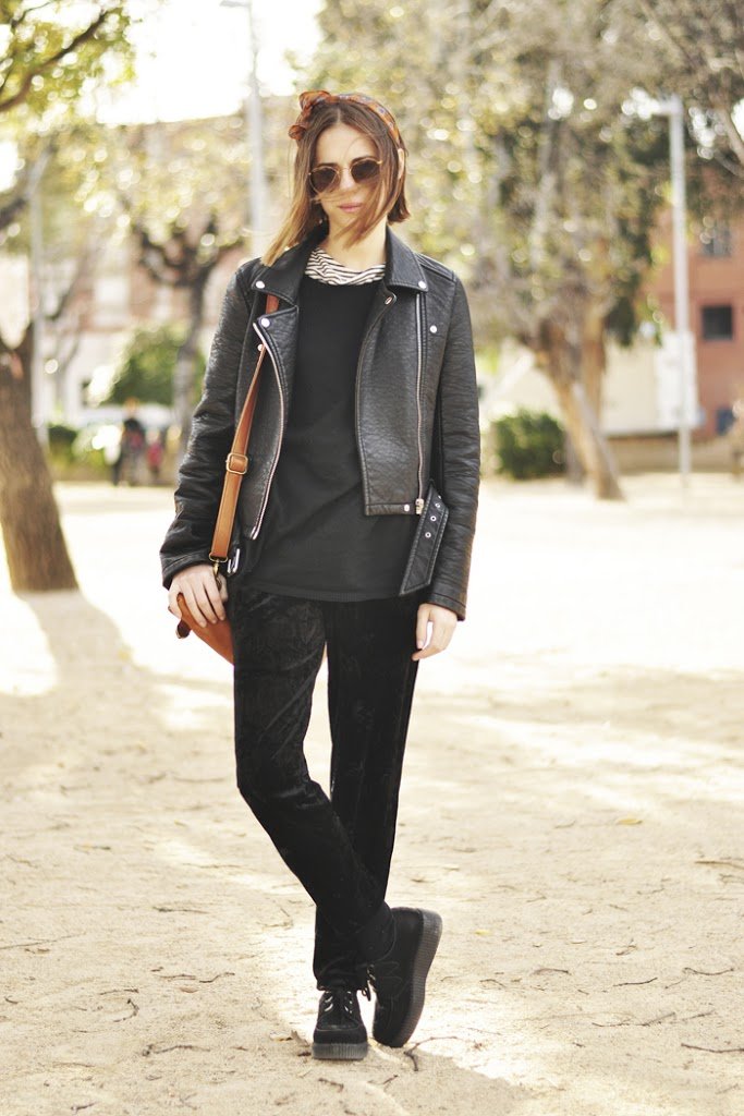 chaqueta de cuero, y un pantalón en color negro, el que yo llevo es en terciopelo podéis conseguirlo en H&M.