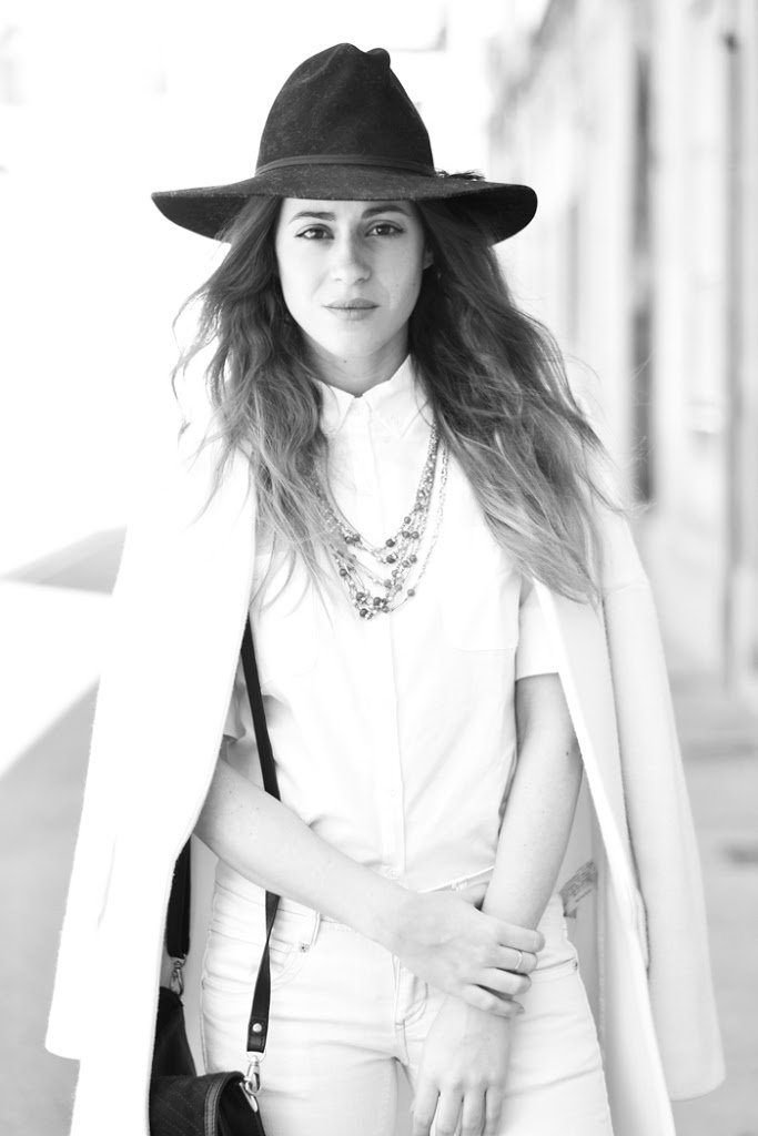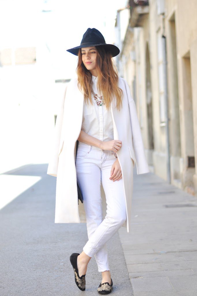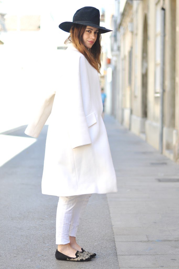 Aunque la primavera ya ha llegado a Barcelona, hay días en los que un abrigo algo más fino no viene nada mal. En eso consiste la primavera, en mezclar, chaqueta ahora si ahora no, una locura vamos. Para hoy, un look sin complicaciones Black&white. Me encanta el color blanco, así que para este día decidí ponerme en plan fantasma y romper con el sombrero y mis nuevos slippers.