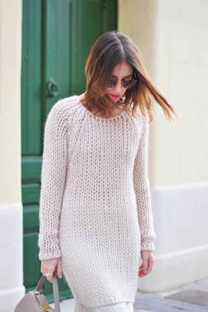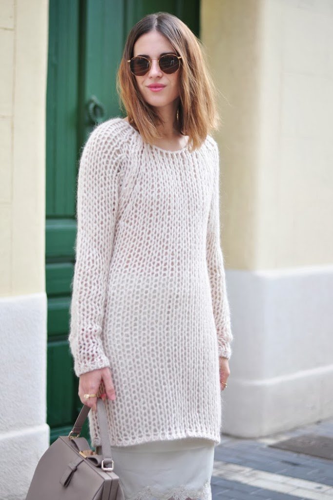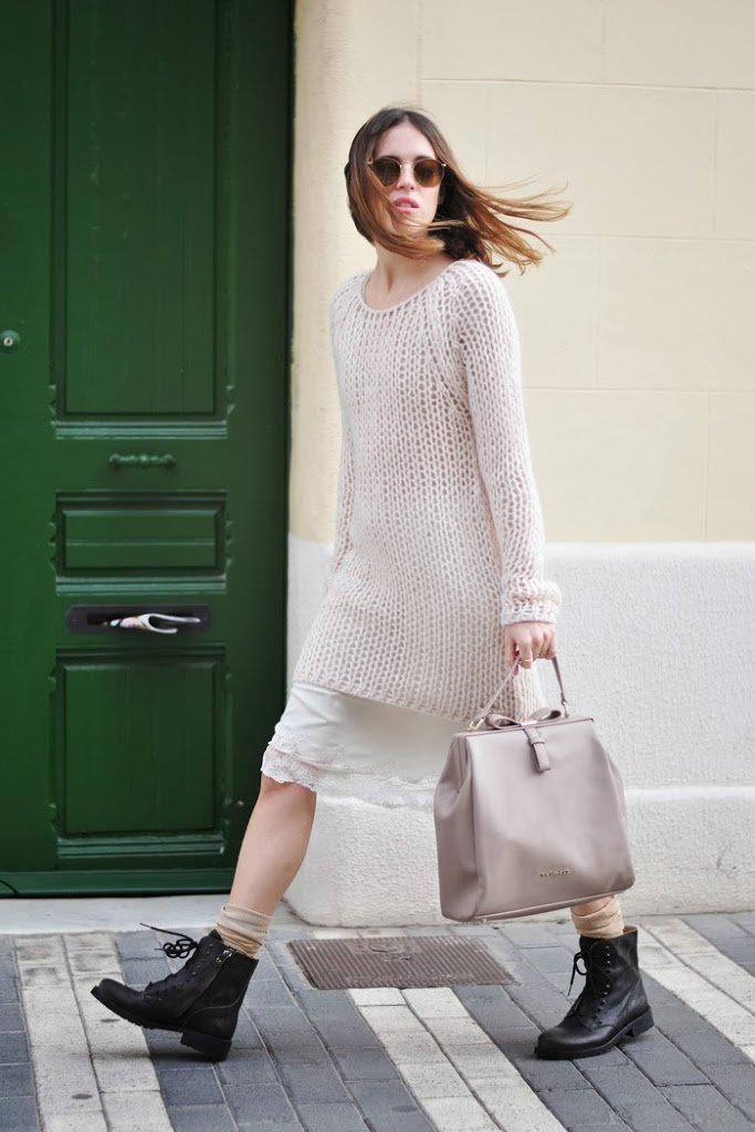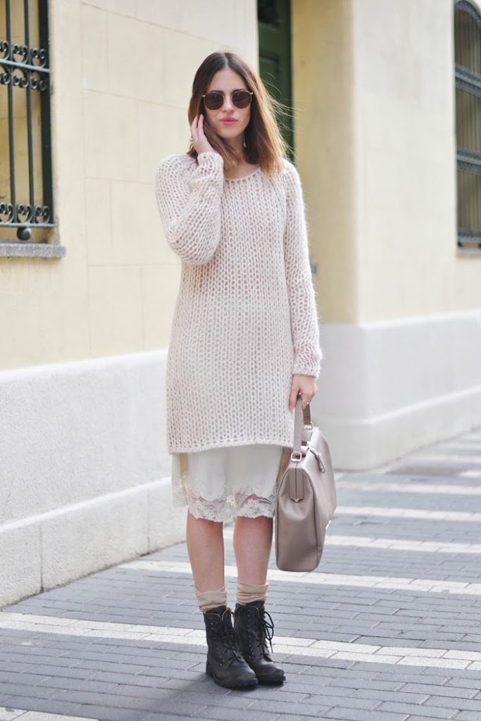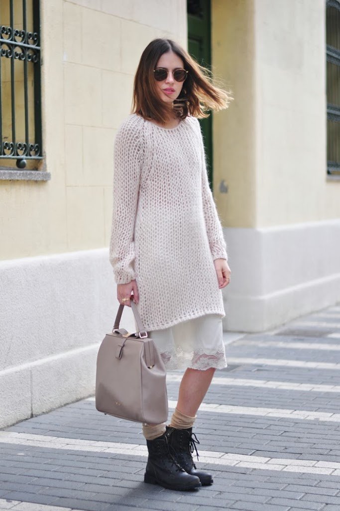 Combinación que estamos viendo mucho, jersey de lana con lencería, muy original con esas botas tan distintas de lo demás!