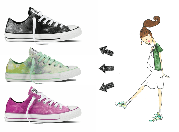Una de las protagonistas para esta temporada es la nueva colección Chuck Taylor All Star Tie-Dye, una zapatilla genuina donde las telas son vivos lienzos. Además encima de una base de matices oscuros, una variedad de colores brillantes dan color a la tela para maximizar el impacto visual.