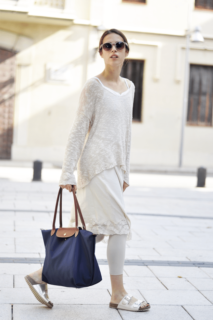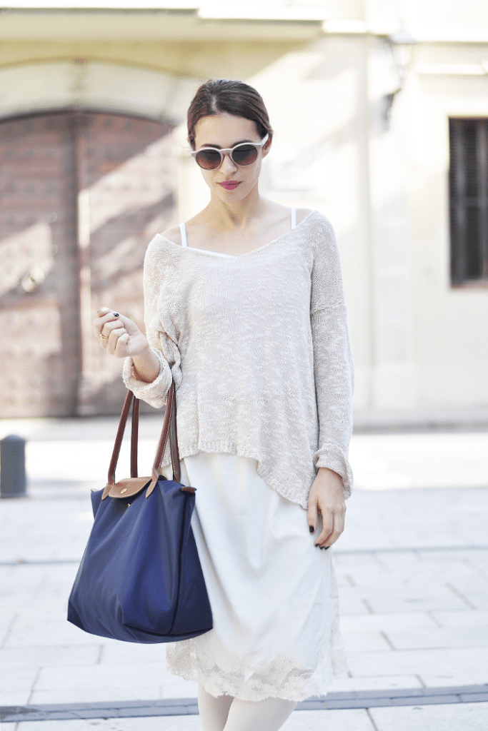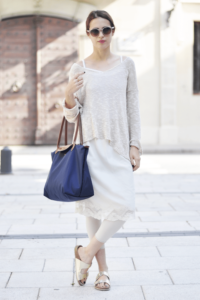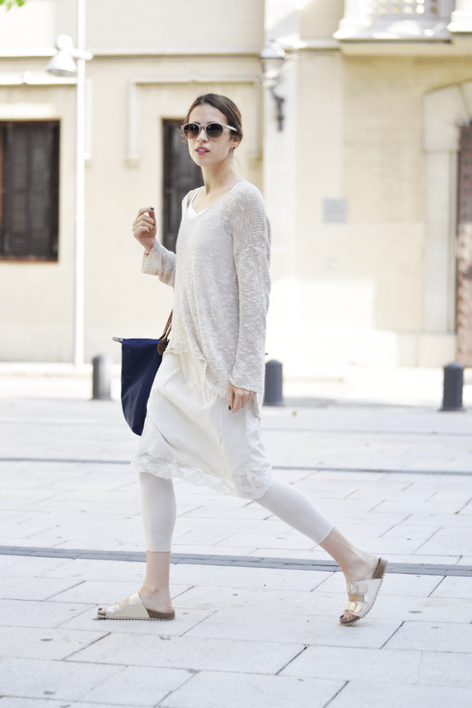 Me encanta este look en color crema! Muy chulo lo de combinar vestido y leggings!