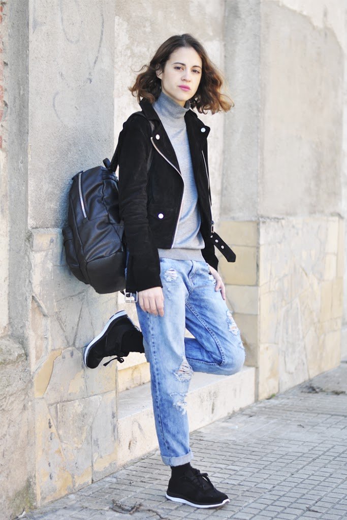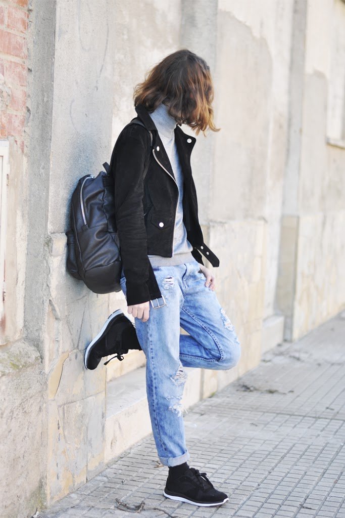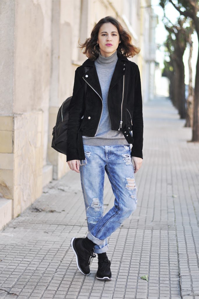 Desde muy pequeña siempre me ha gustado llevar los vaqueros rotos. Y no me refiero a esos pantalones con rodilleras y agujeros alrededor totalmente destrozados, eso es otra historia (aunque visto lo visto, si Karl saca una colección, seguro que se ponen de moda) sino a los jeans tipo boyfriend «estratégicamente» rasgados. Un tipo de vaquero que queda bien con todo: con bailarinas, con zapatillas, stilettos… En esta ocasión y por la comodidad que caracteriza mi estilo, he combinado los míos con unas zapatillas de deporte, mi nueva cazadora en ante de Blanco y un suéter básico con cuello cisne. No se trata de un look espectacular, pero seguro que todas tenéis prendas muy parecidas para crear un look muy similar y tan fácil, ¿verdad?